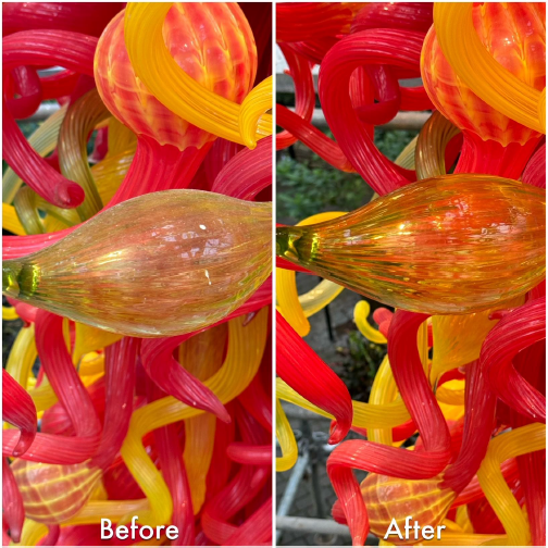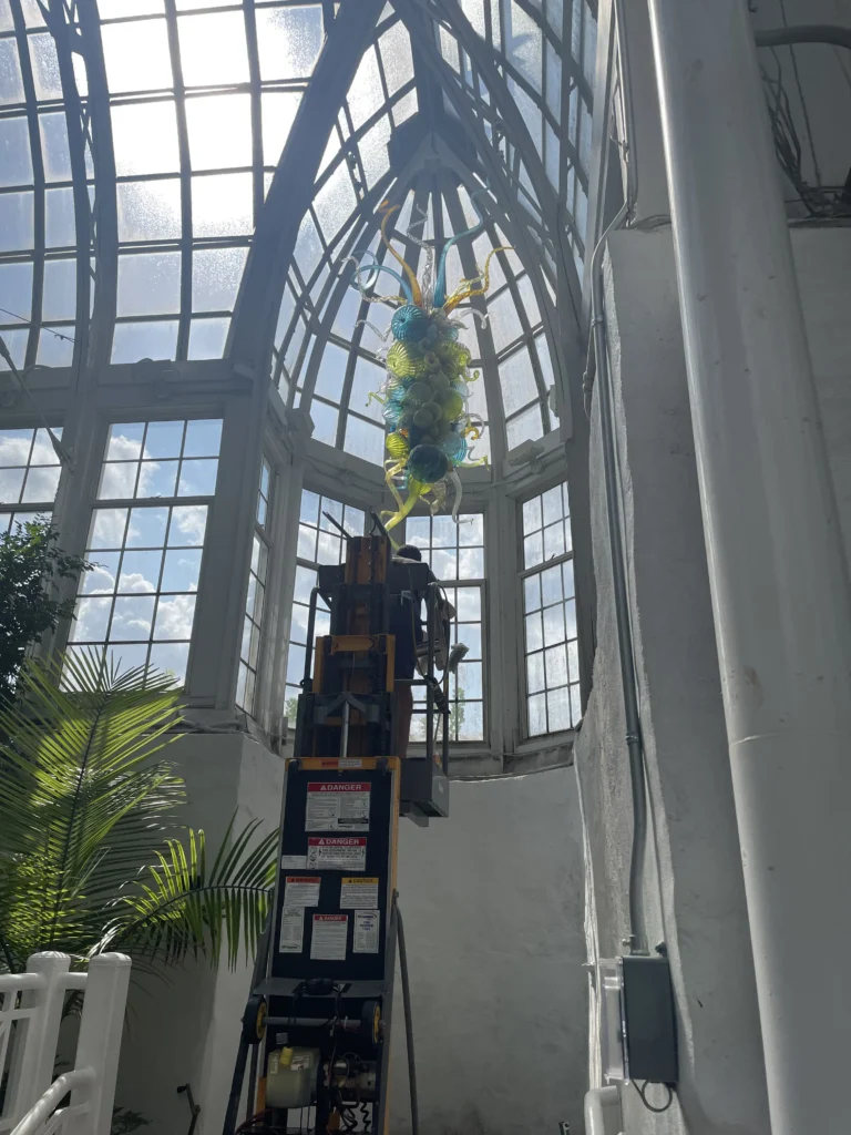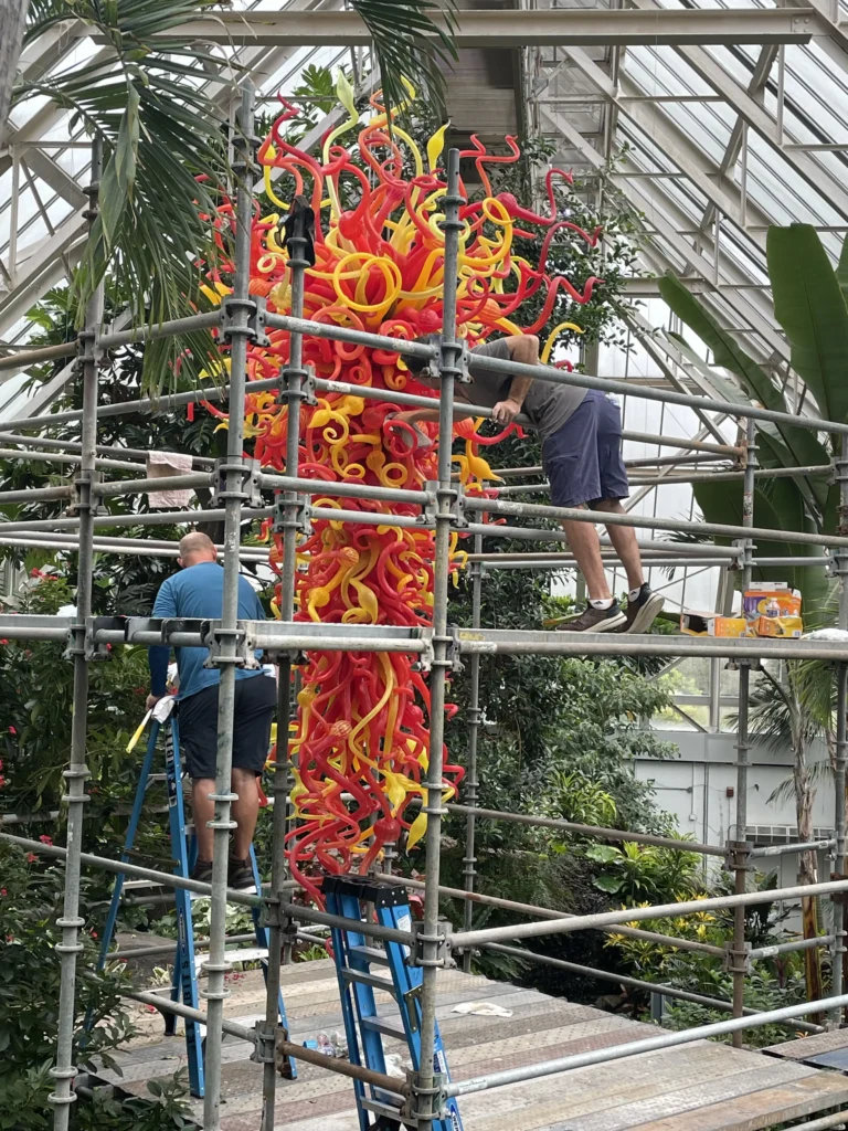 Nick described the differences between the Conservatory’s day-to-day upkeep of the collection and Denny Park’s specialized cleaning: “For our routine, it’s a surface clean. We all use the same cleaning items: cloth diapers and Sprayway glass cleaner to dust and keep things looking sharp. But when Denny Park is here, it’s a deep clean, detailed and technical. They’re handling parts of installations we don’t touch, sometimes even disassembling pieces to check for hidden issues. This year, they worked on the Cobalt and Clear Chandeliers, where one glass stem had filled with water from our irrigation watering. They drained, cleaned and resealed it. Their expertise goes a long way in keeping everything pristine.”