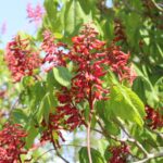 The Red Buckeye, a member of the Horse Chestnut family, is a small native tree or large shrub that is common in woods, along stream beds and on rocky hillsides in the Southern and Eastern United States.The common name Red Buckeye refers to the 6-8’ dark red tuberous flowers that form in showy clusters in the spring. These impressive flowers provide nectar for early hummingbirds and bees. The word Buckeye describes the nut-like seeds that resemble the eye of a buck deer. Squirrels are able to eat the seeds,but they are poisonous to humans and most livestock.