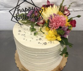This class will teach you how to assemble a buttercream cake decorated with fresh flowers. Each student will receive two layers of cake, buttercream, and detailed instructions on how to trim, fill, stack, and ice your cake. While your cake chills in the fridge, enjoy a glass of wine while building flower clusters to decorate your cake. A box will be provided to transport your masterpiece home!