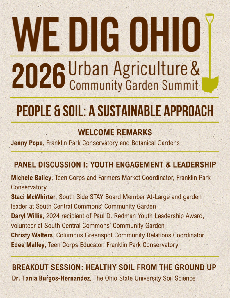 Join us for the 2026 WE DIG Ohio Urban Agriculture & Community Garden Summit, a gathering of garden leaders, community partners, and changemakers from across the region. Hosted at Franklin Park Conservatory and Botanical Gardens and co-sponsored by The Ohio State University Extension, this year’s theme, People & Soil: A Sustainable Approach, explores how collaboration, youth engagement, and healthy soil practices can cultivate stronger, more resilient communities in Columbus, Ohio and beyond.