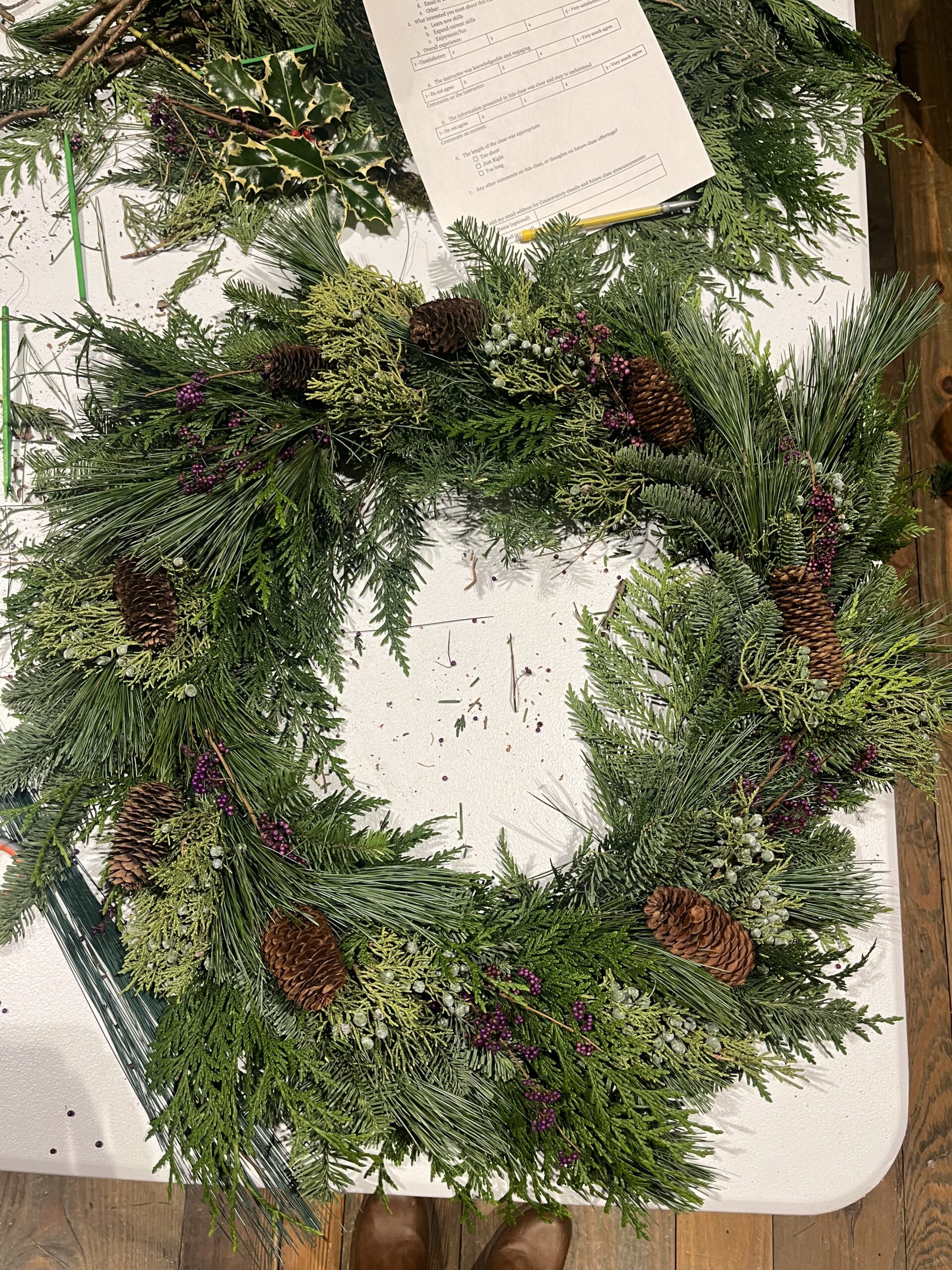 Join us for a cozy winter workshop by the fire! Transform winter greenery into a lush wreath suitable to adorn any front door to celebrate the winter season. In this hands-on workshop, students will combine greenery, berries, and cones in bundles to add to a wire wreath frame. The evergreen wreaths will be topped off with a selection of seasonal decor, picks, and bows to tie it all together. All supplies will be provided, including hot chocolate and tea.