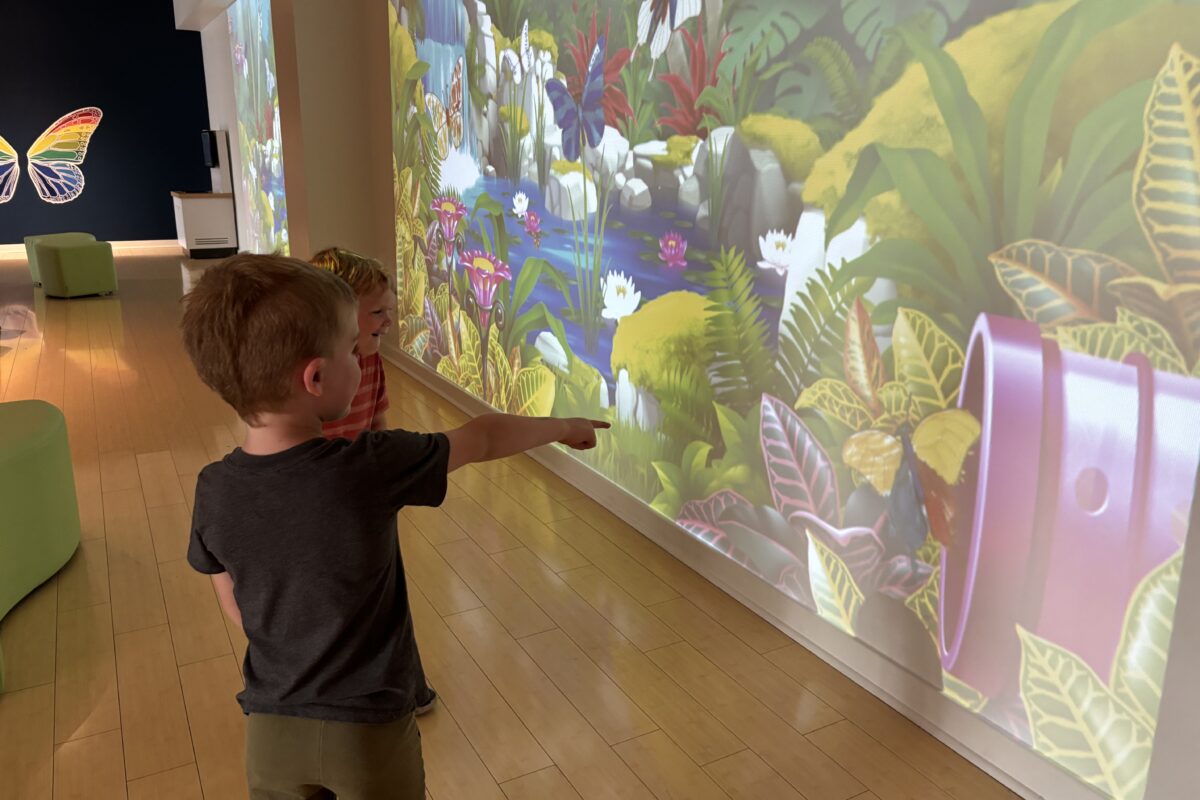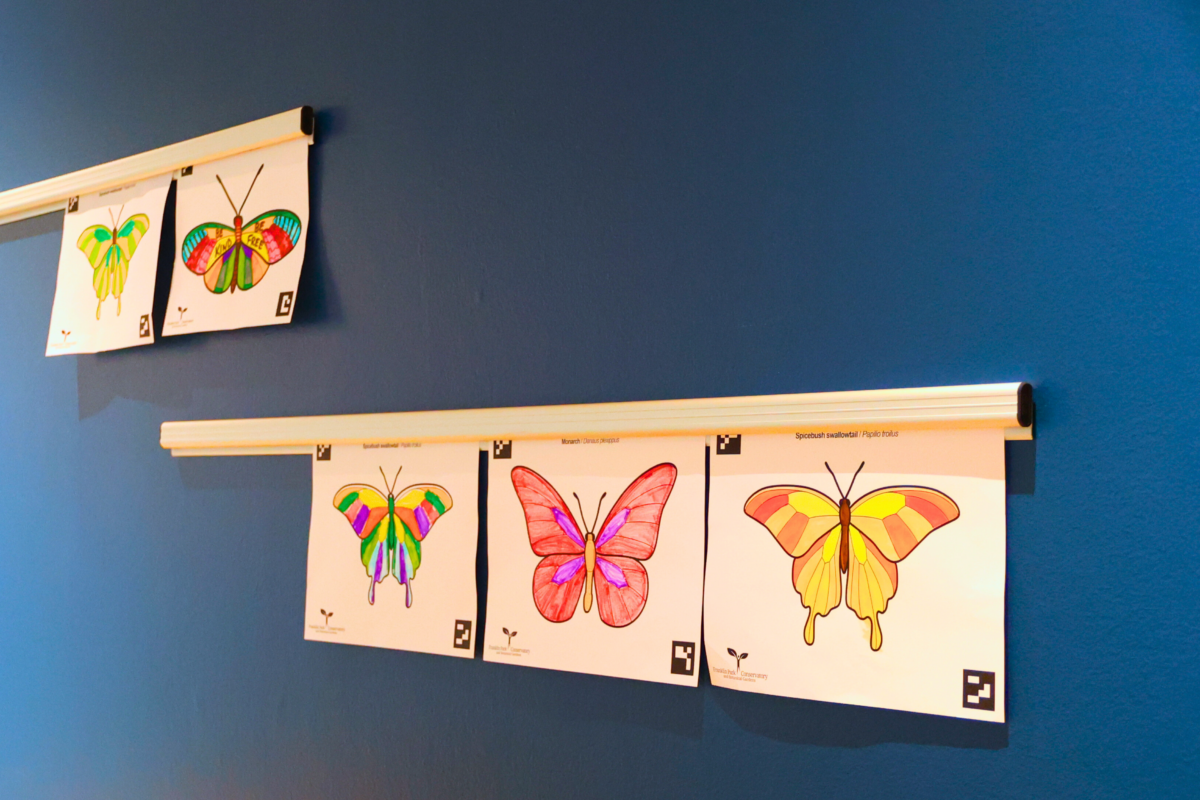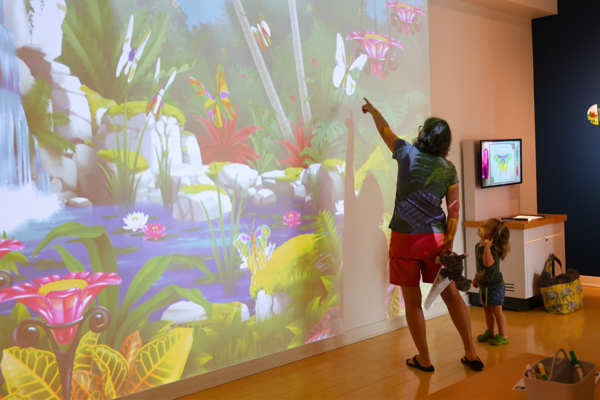 Select and color a butterfly at a coloring station then scan the page at the kiosk to release the butterfly into the digital environment. Watch as the butterfly flutters around the garden and swoops down for a snack on a nearby flower!
