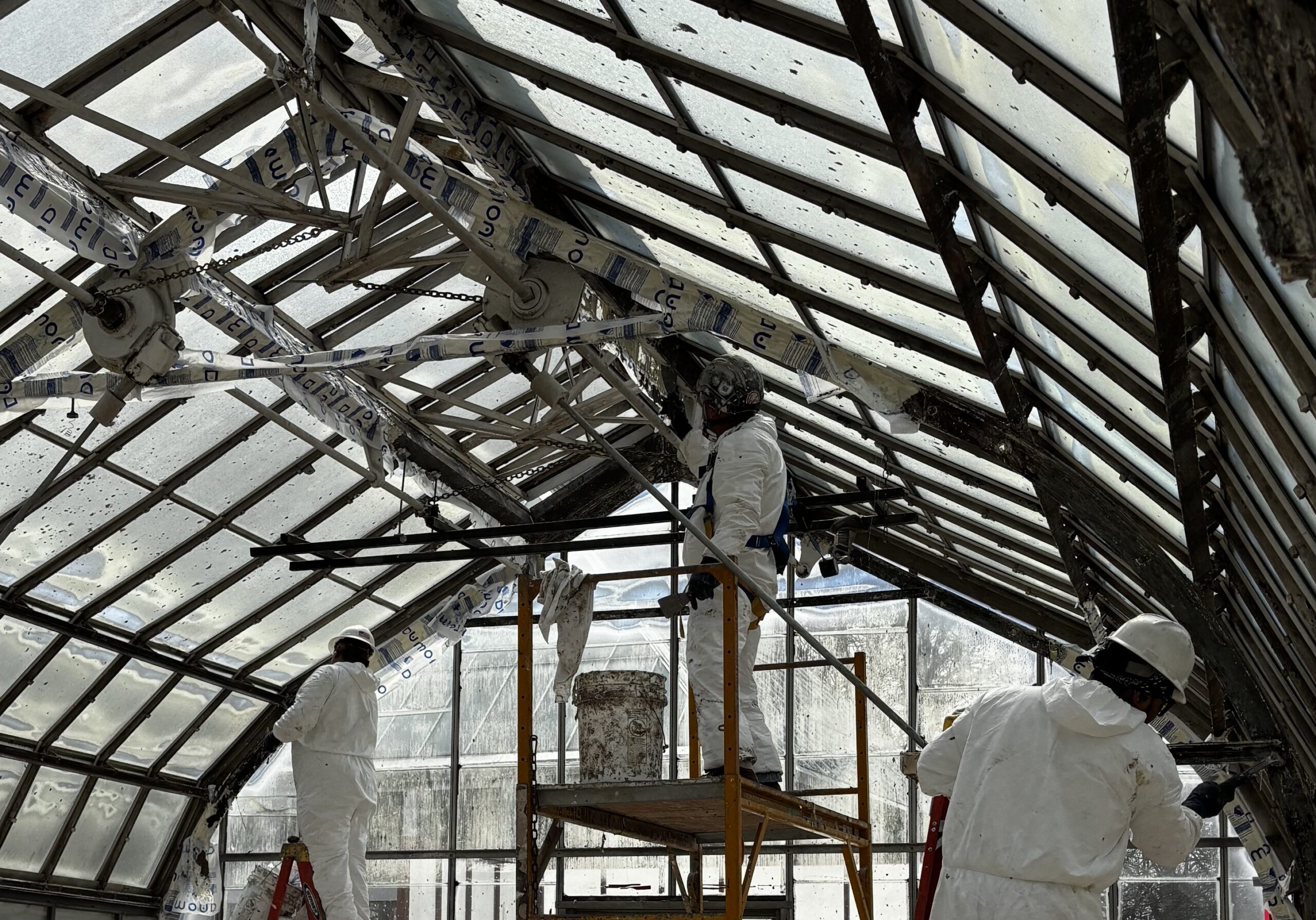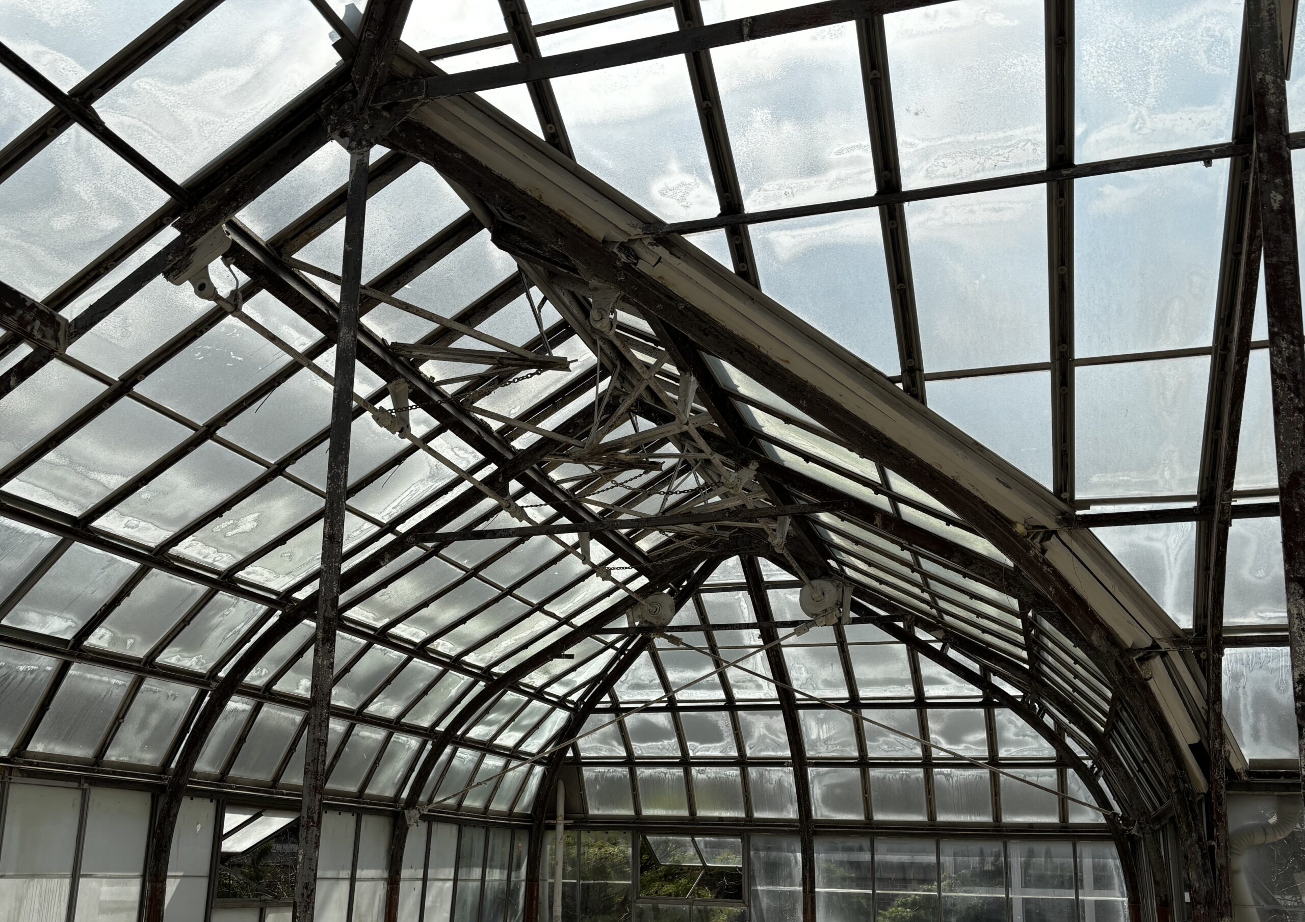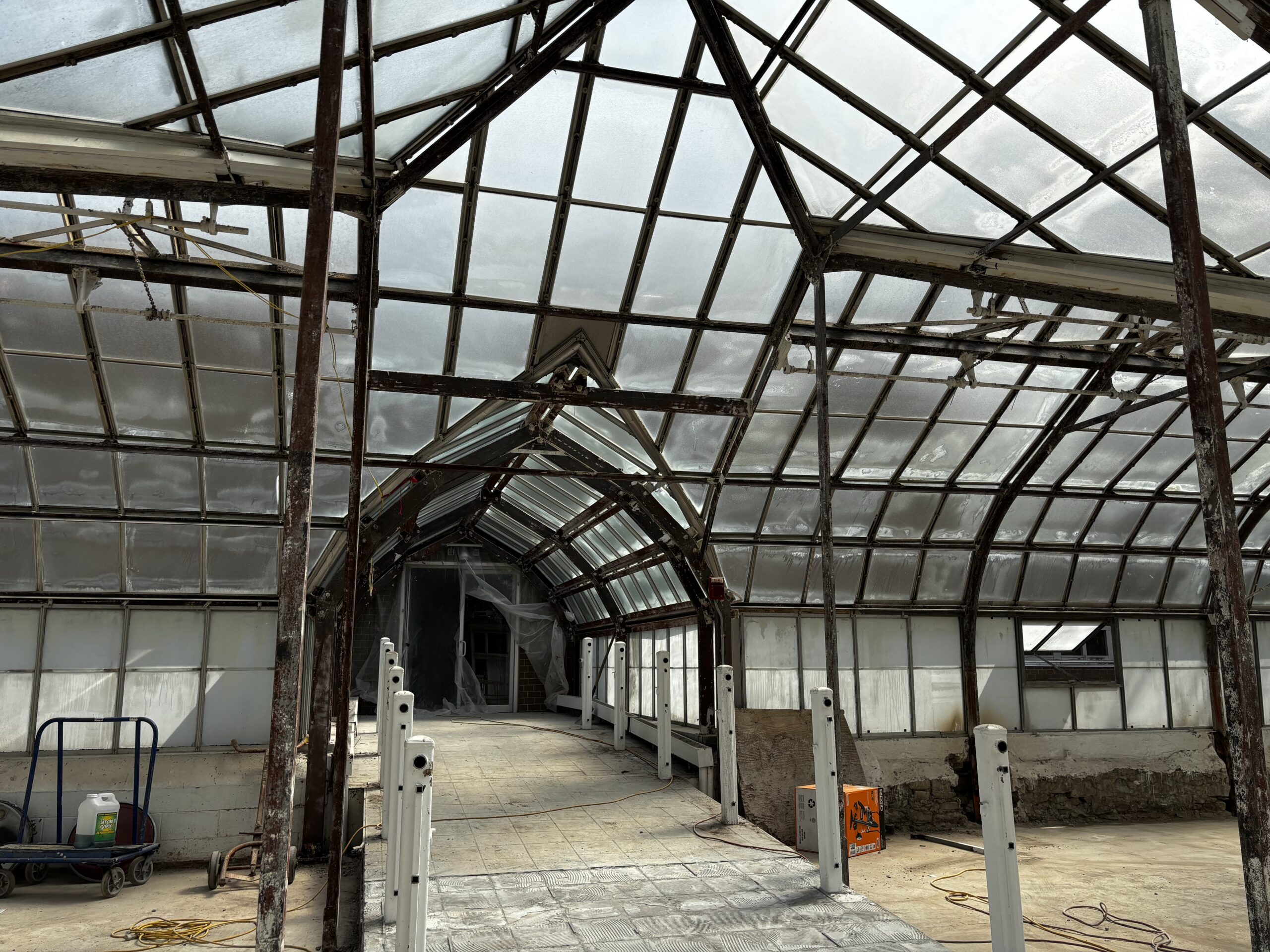 The existing wrought iron arches throughout the Palm House and Showhouse are undergoing structural rehabilitation by inspecting, cleaning, repairing, coating, and if necessary, replacing corroded elements.