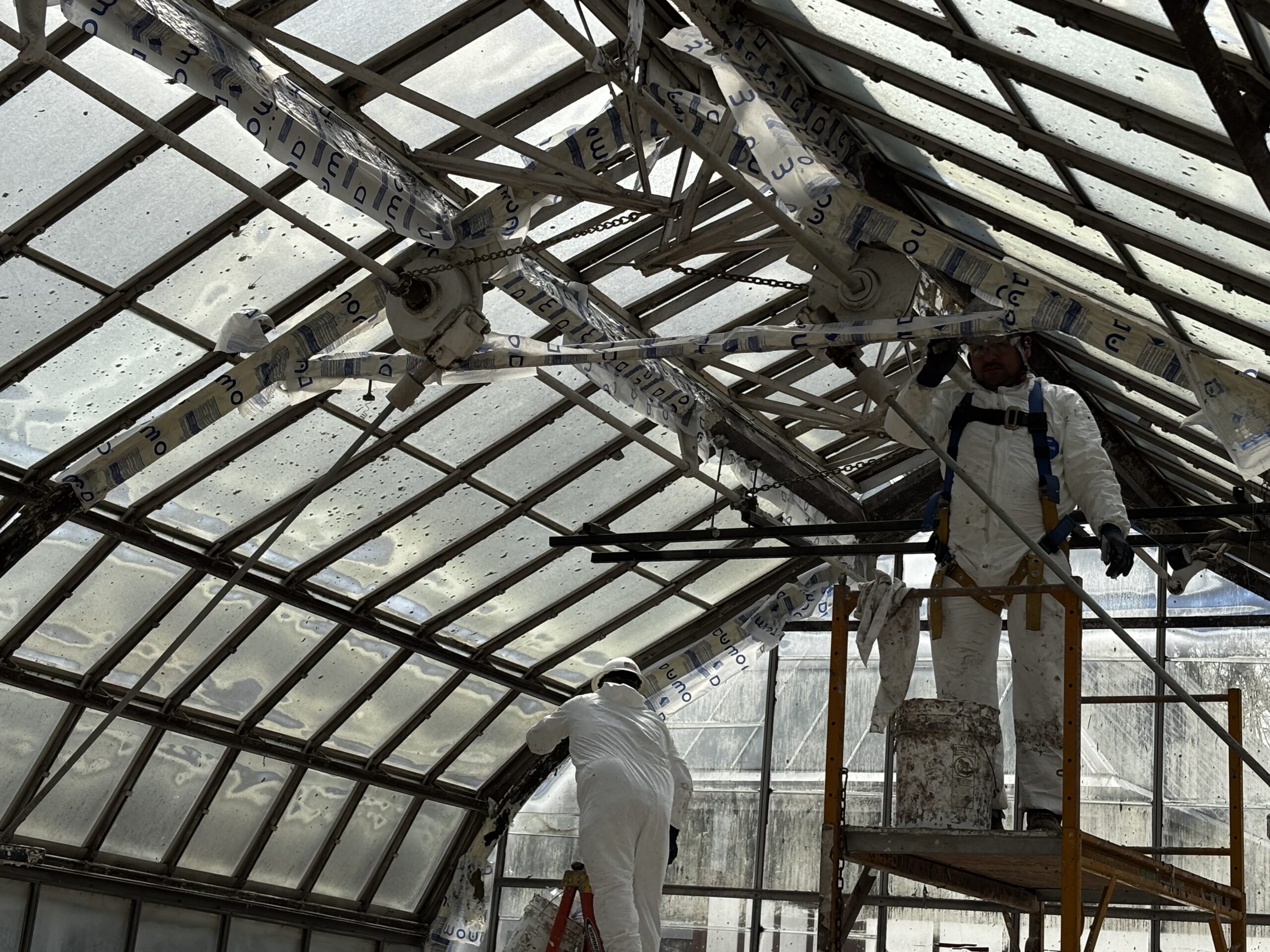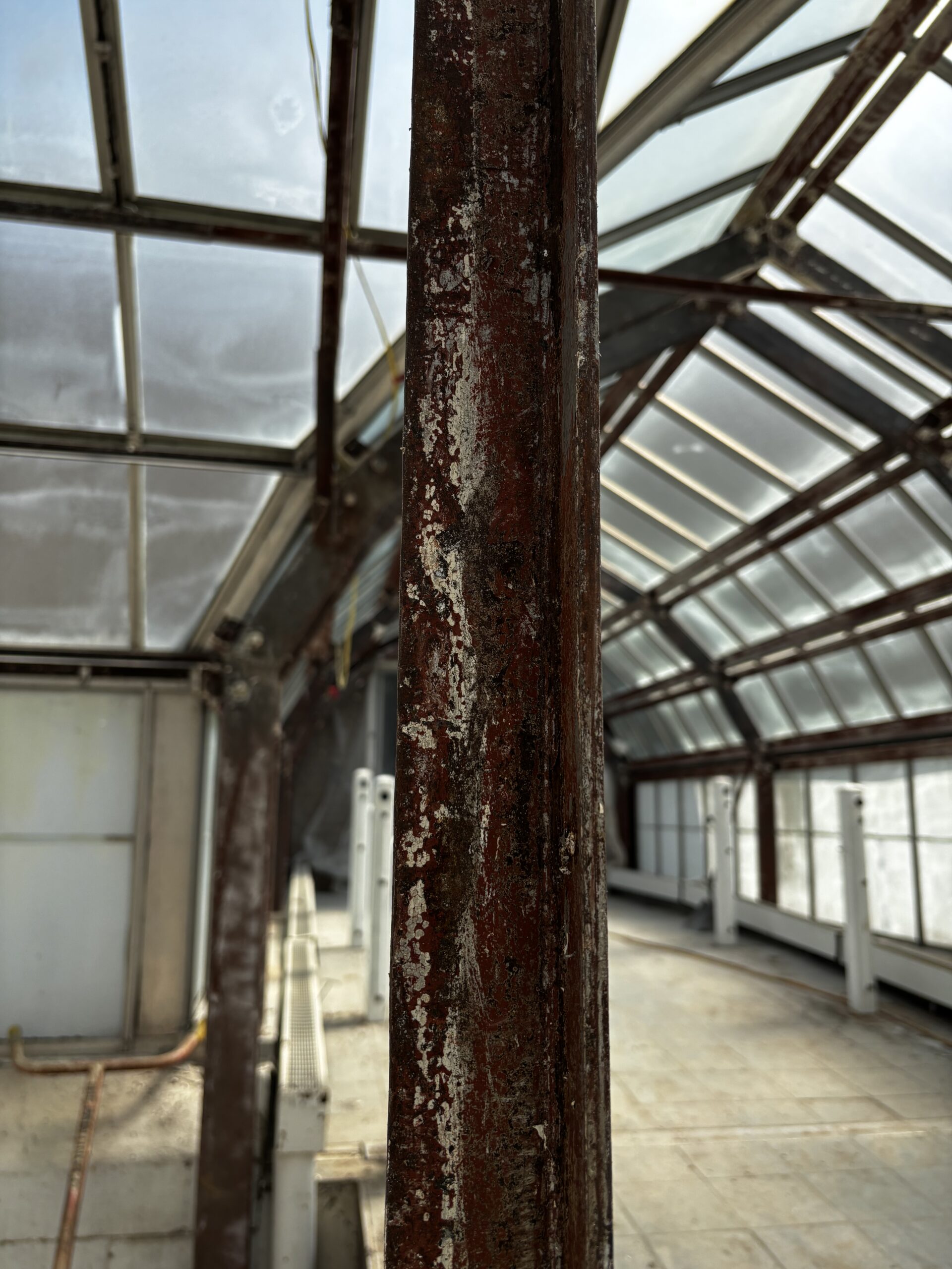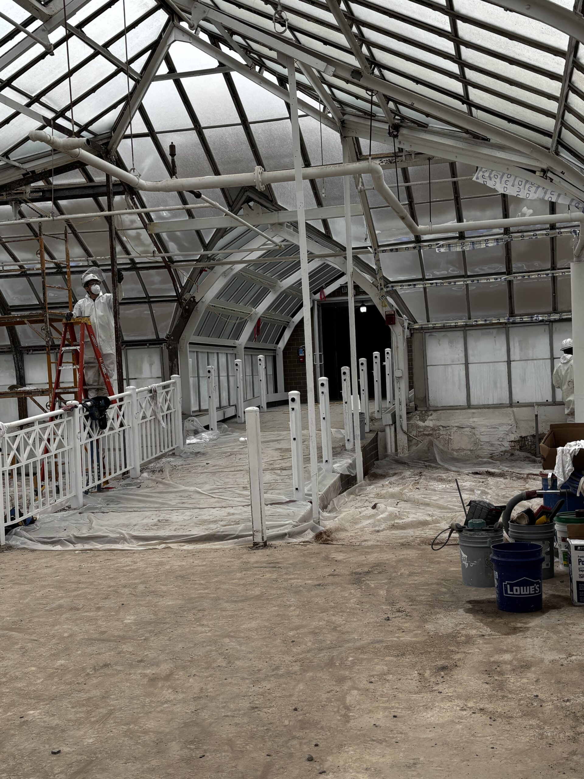 The existing wrought iron arches throughout the Palm House and Showhouse are undergoing structural rehabilitation by inspecting, cleaning, repairing, coating, and if necessary, replacing corroded elements.