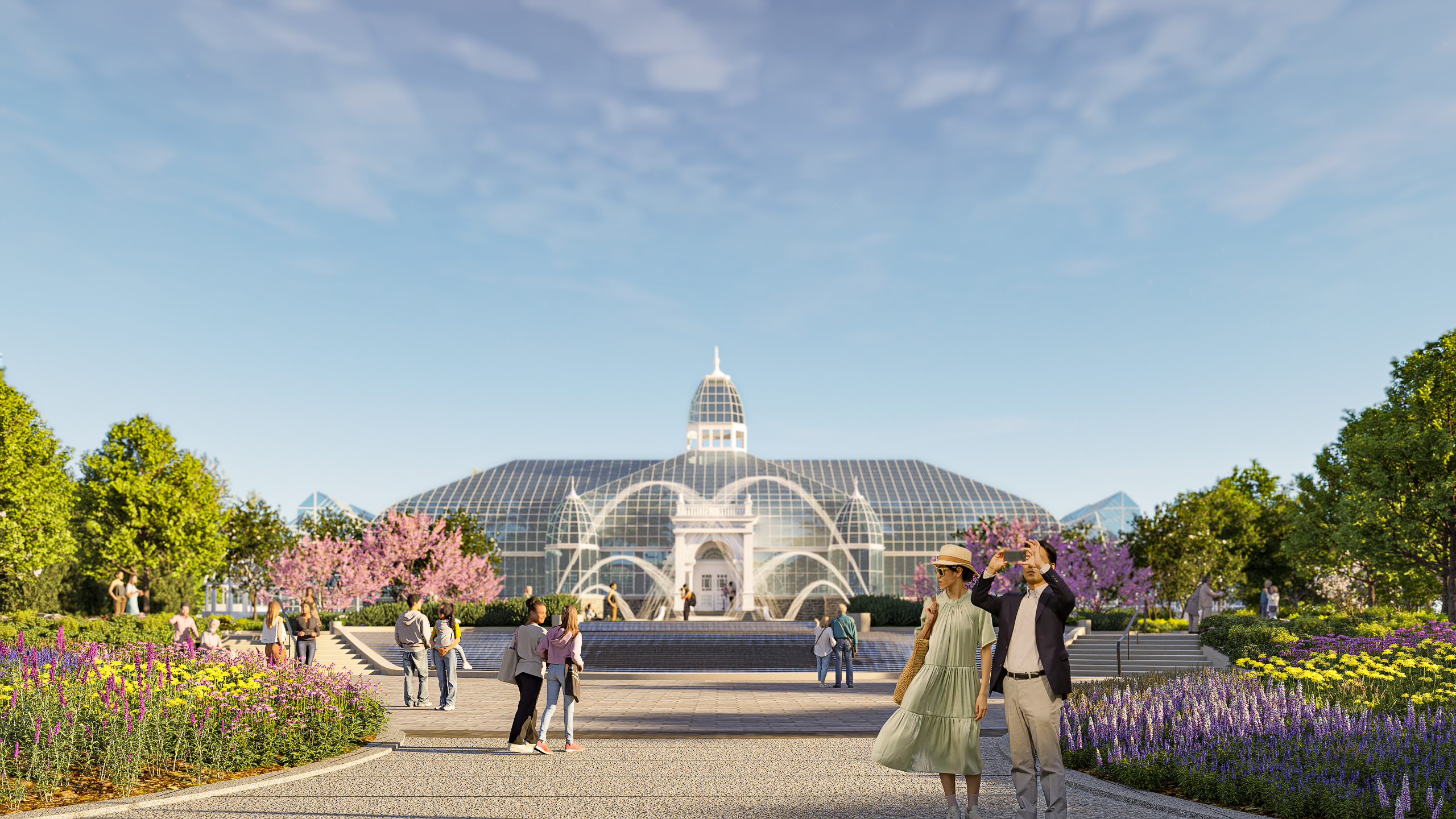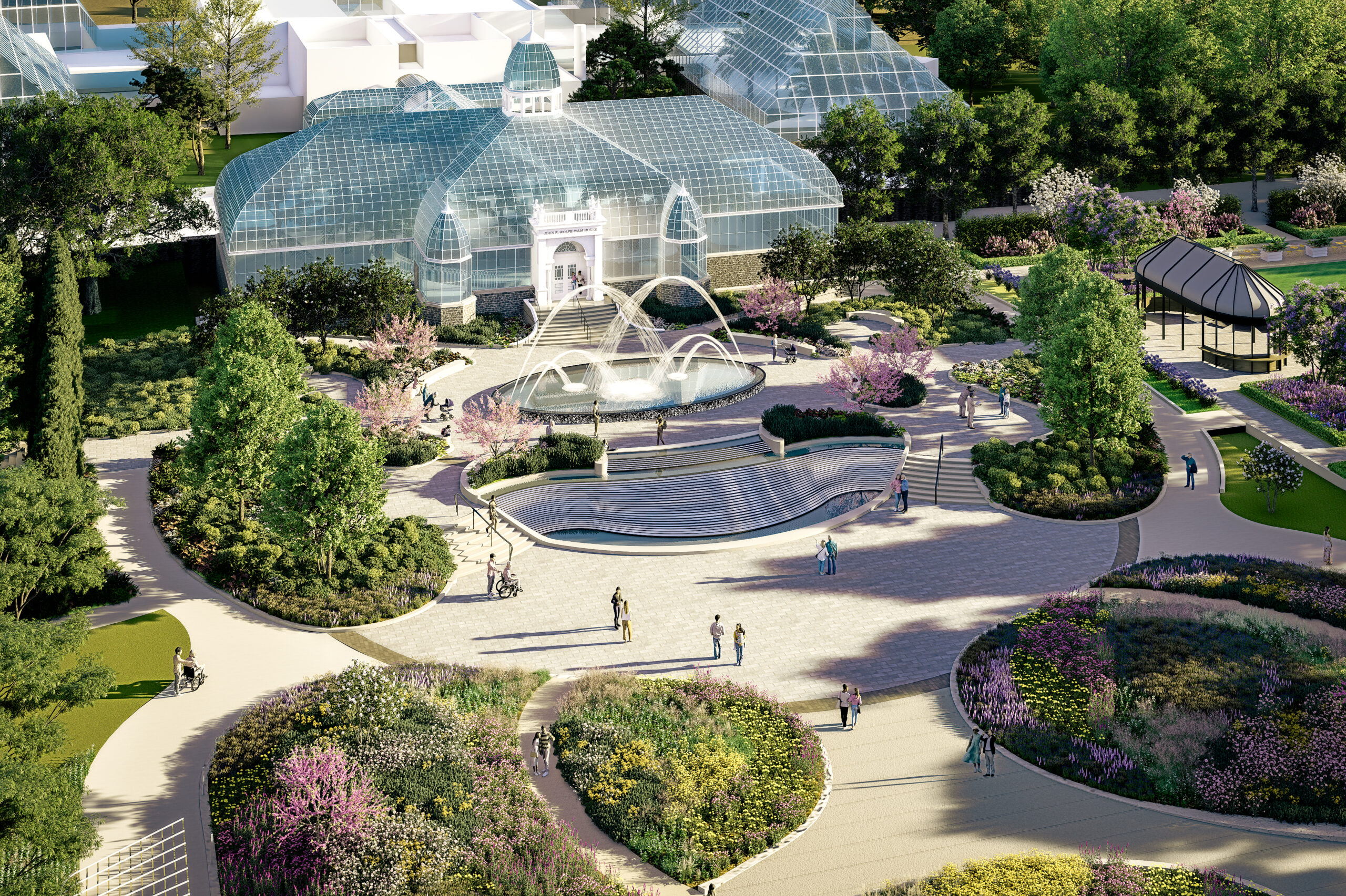 The entrance to the Conservatory’s visitor experience will move from its current location on the east of the park to a central location to the west of the John F. Wolfe Palm House.